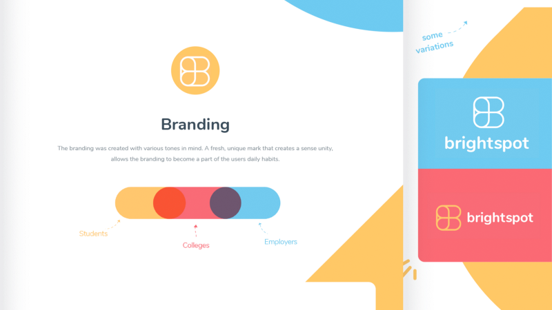 Проект, для которого я разрабатывал айдентику, называется BrightSpot. Его специализация — подбирать студентам колледж и отправлять на учебу, а позже — находить им работодателей. План заключался в том, чтобы найти фирменные фишки, которые подходят всем разделам проекта. Поэтому я разбил айдентику на четыре части, которые смогу сочетать: цвета, логотип, типографика и иллюстрации.