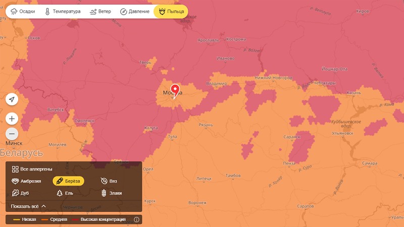 В «Яндекс.Погоде» появилась услуга для пользователей, склонных к аллергии. На интерактивной карте можно увидеть концентрацию в воздухе пыльцы различных растений, которые вызывают отёки слизистых, насморк и другие неприятные симптомы. Зоны красного цвета показывают участки с высоким уровнем опасности, оранжевым — со средним, жёлтым — с низким. Территории серого цвета безопасны для аллергиков, так как опасные растения в этих местах сейчас не цветут. На карте можно выбрать одно из 15 видов растений-аллергенов: амброзию, берёзу, вяз, дуб, ель, иву, клён, крапиву, ольху, злаки, орешник, полынь, сорные травы, сосну и ясень.