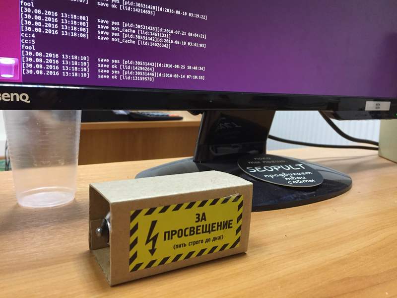 У программиста Тимофея Кормильцева на столе обнаружена рюмка-лампочка «за просвещение», которая досталась в качестве приза в конкурсе CyberMarketing года три назад.