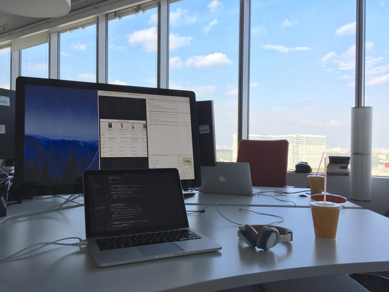 Мониторы замылены, ибо коммерческая тайна:) Помимо компа важные вещи: кружка, из неё пьют кофе, который потом превращается в программный код; датчик уровня CO2, позволяет не забывать про проветривание в комнате, ибо без свежего воздуха никуда; наушники - позволяют создавать и поддерживать правильную рабочую атмосферу.